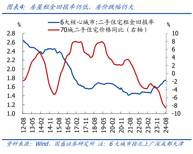 >提高保障性住房再贷款央行出资比例。5月17日,央行设立3000亿元保障性住房再贷款,利率1.75%,央行按照贷款本金的60%发放再贷款,银行配套剩余的40%。央行公布数据显示,截止6月底仅使用了121亿元,指向银行和地方政府收储的意愿不足。本次将央行出资比例提高到100%,进一步降低了地产收储的资金成本,有助于增强对收购主体的市场化激励。但考虑到当前租售比仍然较低(8月6大核心城市仅有1.75%)、房价仍在快速下行,实际收储落地仍面临约束。