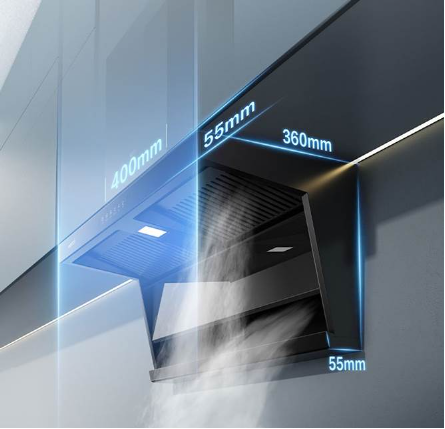 油烟机吸排油烟效果的好坏,在设计上有两个极为重要的点:第一是拢烟能力,要确保油烟不逃逸。第二是吸烟的位置,要确保距离合适才能高效吸排不扩散。