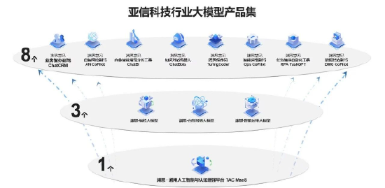 目前,亚信科技聚焦“平台、模型、工具”层面,建立起了覆盖大模型研发到应用落地的“全生命周期”产品体系,能够帮助各行业客户“一站式”获得大模型能力。产品体系包括: