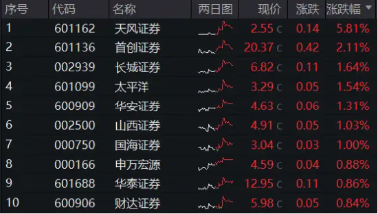 板块个股方面,截至收盘,天风证券涨近6%,涨超2%,、、等5股涨逾1%,、、等跟涨居前。