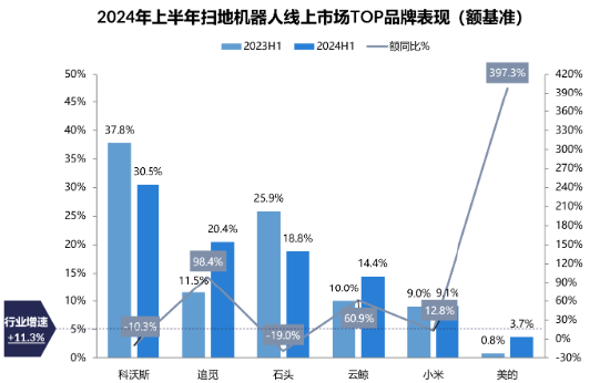 从品牌份额来看,2024年上半年,在扫地机器人线上市场,追觅市场份额达到20.4%,零售额同比增长高达98.4%,远超行业11.3%的平均增速,增速在TOP5品牌中位居第一。