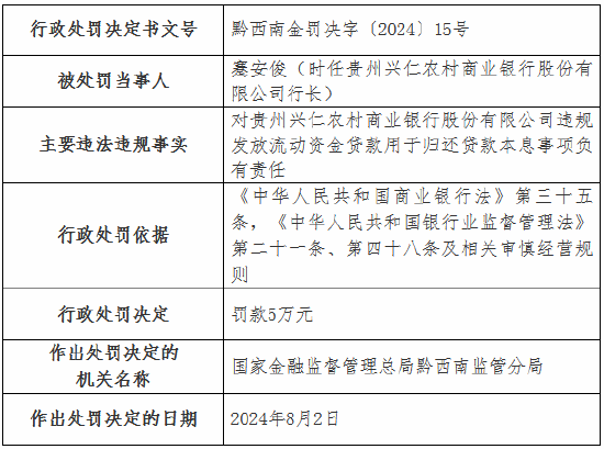 蹇安俊(时任贵州兴仁农村商业银行股份有限公司行长)对公司违规发放流动资金贷款用于归还贷款本息事项负有责任,被罚款5万元;周兴润(时任贵州兴仁农村商业银行股份有限公司行长)对公司违规向客户转嫁成本事项负有责任,受到警告。