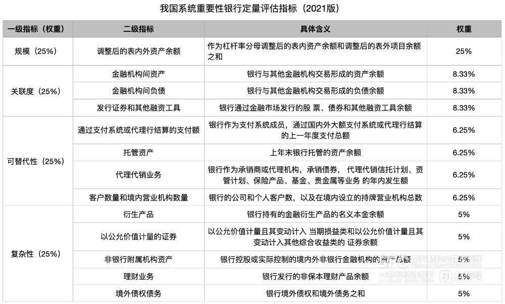 与此同时,巴塞尔委员会制定了全球系统重要性银行的评估标准,并每三年对评估标准进行更新。最新的评估标准修订于2021年,包含跨境、规模、关联度、可替代性、复杂性等五个方面。